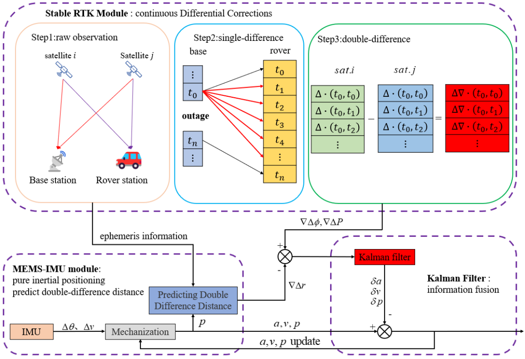 GNSS-RTK和MEMS-IMU结合的组合导航系统是户外常用的高精度、低成本定位方案。然而,MEMS-IMU的显著测量误差会迅速导致基于惯性误差传播模型的导航状态预测发散。为了克服这一限制并提高准确性,保持RTK测量信息的连续性至关重要。然而,由于无线传输链路不稳定、通信设备可靠性不足或基站观测数据丢失等原因,差分校正信号经常出现中断,导致测量信息质量下降,进而影响组合导航系统的精度。因此,本文提出了一种稳定的RTK/MEMS-IMU紧耦合算法。在差分校正中断期间,该算法利用基站的历史差分校正以及实时流动站信息来构建稳定的双差载波相位矢量。这种方法保证了测量信息的稳定性,提高了定位精度。仿真结果验证了该方法的有效性。同时陆地试验结果表明,与传统的RTK/MEMS-IMU紧耦合算法相比,该算法在差分校正中断期间的位置精度和速度精度分别有29.5%和18.4%的提升。