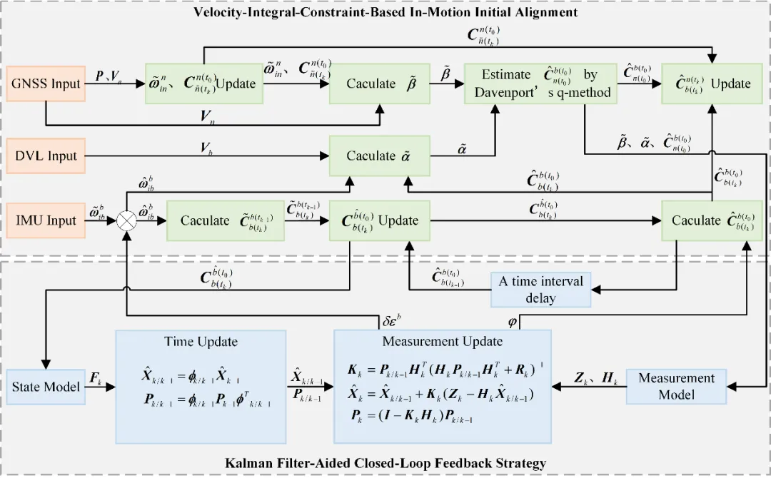 初始对准作为水下组合导航系统正常工作的前提,其对准的速度和精度对于导航系统性能至关重要。水下载具的弱机动特性与低成本MEMS-IMU的较大器件偏差是影响动态对准效果的关键因素。为提高低成本组合导航系统在弱机动条件下的动态对准性能,本文提出了一种新的基于速度积分约束的卡尔曼滤波辅助优化对准方法。通过利用速度积分空间约束关系构建观测,避免了因机动不足所造成的加速度观测失效问题,为弱机动场景的动态对准问题提供了有效解决方案。同时,本文基于卡尔曼滤波技术设计了能够联合估计IMU零偏、载体坐标系姿态误差的闭环修正策略,进一步提高了动态对准求解模型中观测量构建精度。经仿真及现场试验表明,对于弱机动条件下低成本组合导航系统的动态对准,所提出的方法相比于最先进的方法具有快速、精确的优势。
