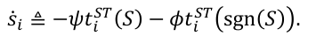 其中,ψ 和 φ 是调节参数。定义 sgn(S) ≜ [sgn(s₁), …, sgn(sN)]ᵀ,其中 sgn(·) 是符号函数。结合所有节点,我们得到了紧集形式的趋近律: