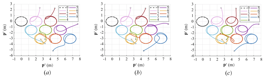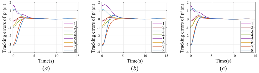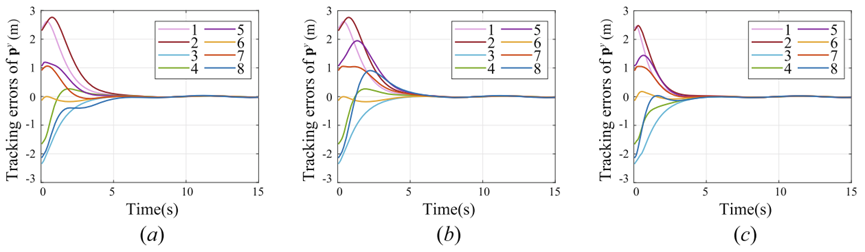 测试结果表明,在这三种不同的通信拓扑结构之下,所有跟随者均能够到达预定位置,并在保持理想编队结构的前提下,实现沿圆轨迹的协同运动,且所有跟随者的跟踪误差能够快速收敛。