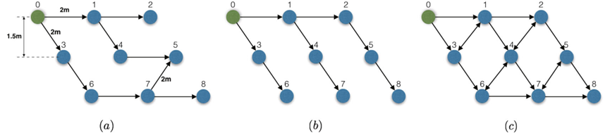 为验证所提方法的有效性,本文选用独轮车模型(unicycle model)作为研究对象。在三种不同的通信拓扑结构下,独轮车系统应形成如下的编队形式: