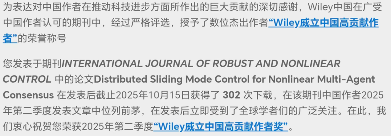 湖南大学智能车辆课题组联合清华大学、加州大学伯克利分校等研究团队,在多智能体协同控制领域取得重要进展。相关研究成果已发表于《International Journal of Robust and Nonlinear Control》。该论文在 2025 年第二季度中国作者发表的文章中表现卓越,影响力位居前列,荣获 2025 年第二季度“Wiley 威立中国高贡献作者奖”。